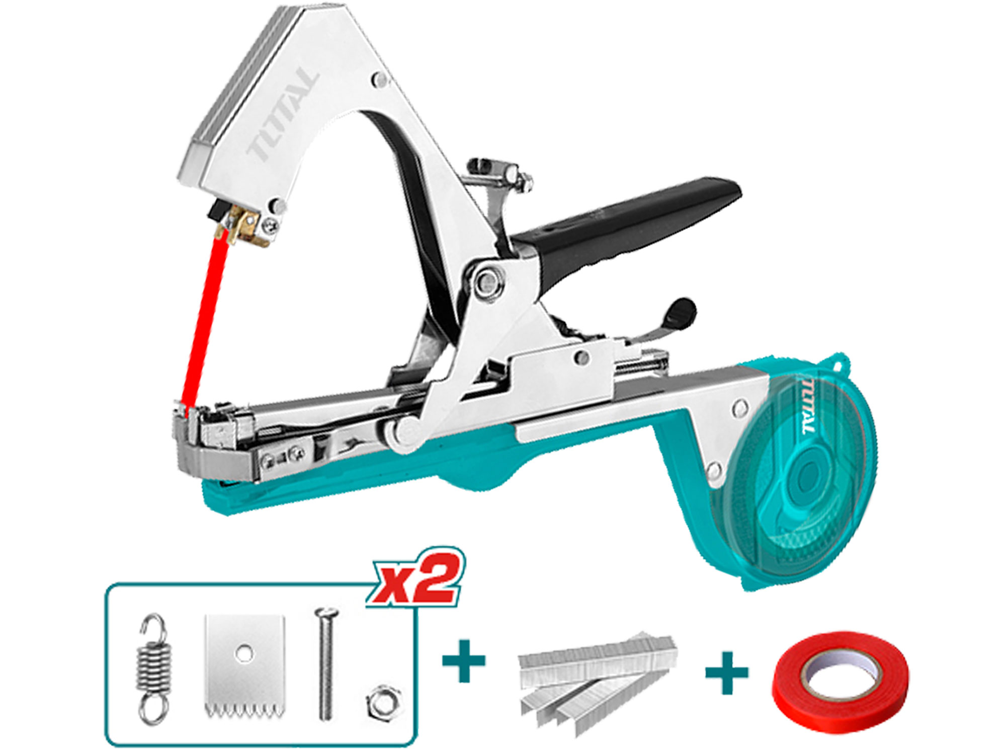 The garden pliers come with 1 piece of stretchable garden tying tape measuring B11 mm x L25 m and 200 clips measuring 7 mm x L4 mm x B0.55 mm. This way, you always have enough material on hand to tie and fix your plants.
