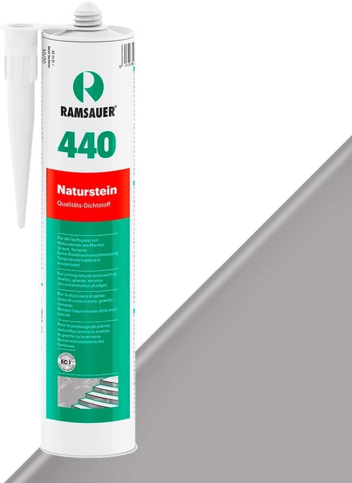 Ramsauer Naturstein 440, 310 ml, manhattan is a specially developed sealant for grouting natural stone such as marble, granite, terrazzo, etc. In contrast to conventional silicone sealants, no edge contamination occurs on contact with these building materials. NATURSTEIN 440 contains fungicidal and bactericidal agents and is resistant to the usual cleaning agents and disinfectants. NATURSTEIN 440 is suitable for use in joints subject to heavy loads and in underwater areas.