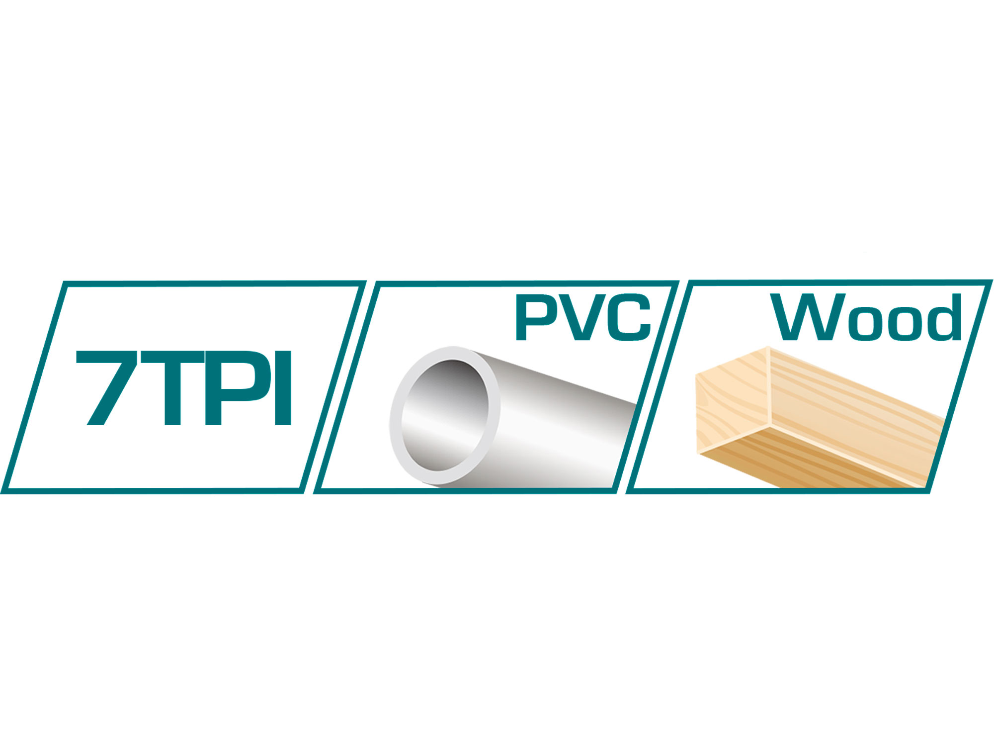The saw has 7 teeth per inch (TPI), which makes it ideal for cutting various materials. The higher the TPI number, the finer the cut the saw produces.