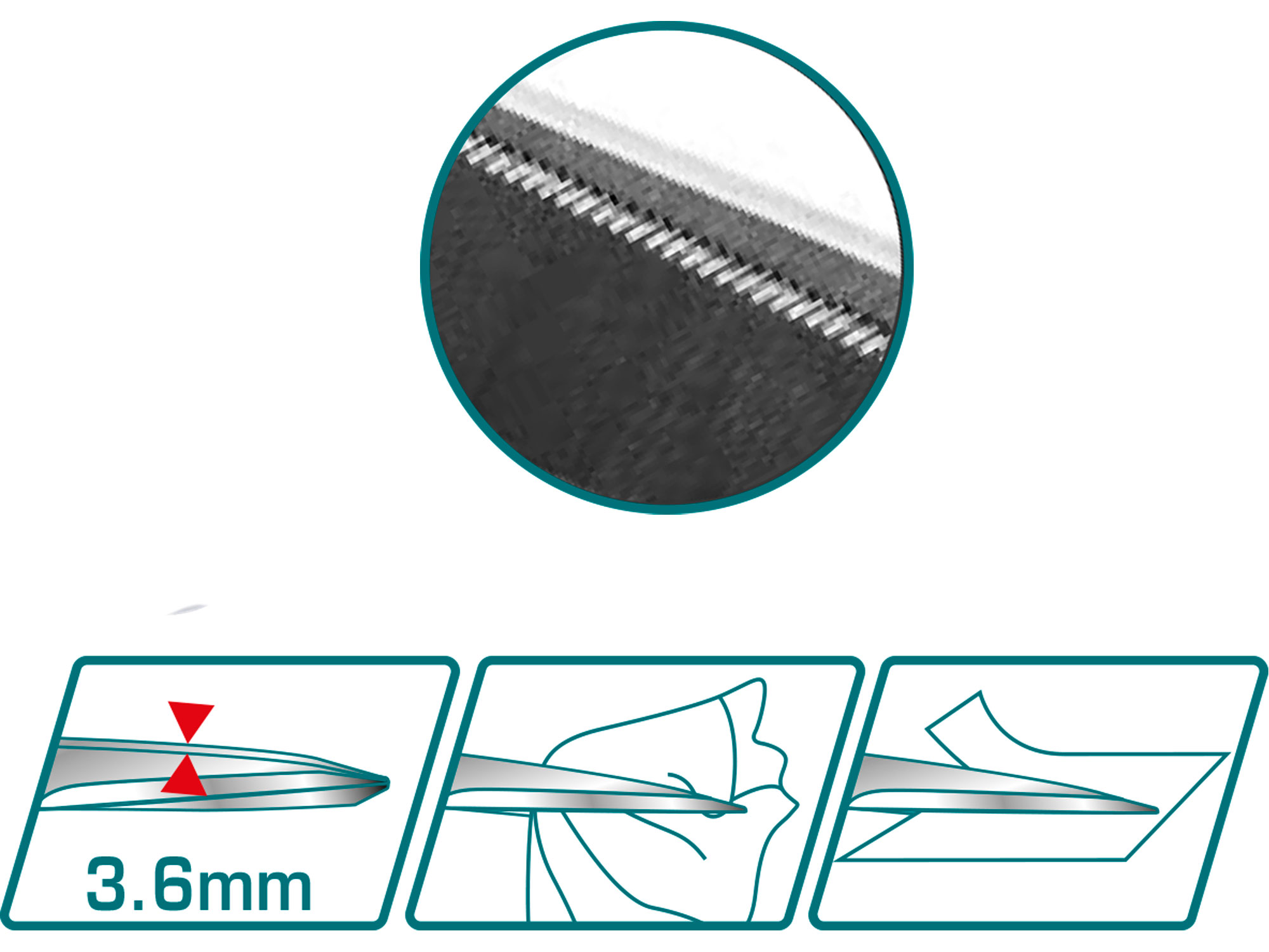 The unique spring design enables easy and effortless handling, while the ergonomic design optimises the handle and ensures comfortable and safe handling. The handle is reinforced with stainless steel along its entire length, making the scissors even more robust and resistant.