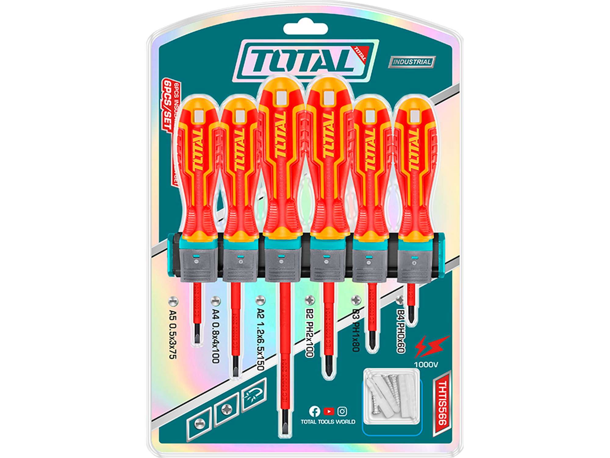 This set of 6 screwdrivers is specially designed for industrial use and complies with VDE standards for electrical appliances up to 1000 volts. The set contains six different screwdrivers, including slotted screwdrivers with sizes (-)3×75, (-)4×100, (-)6.5×150 and Phillips screwdrivers PH0×60, PH1×80, PH2×100.