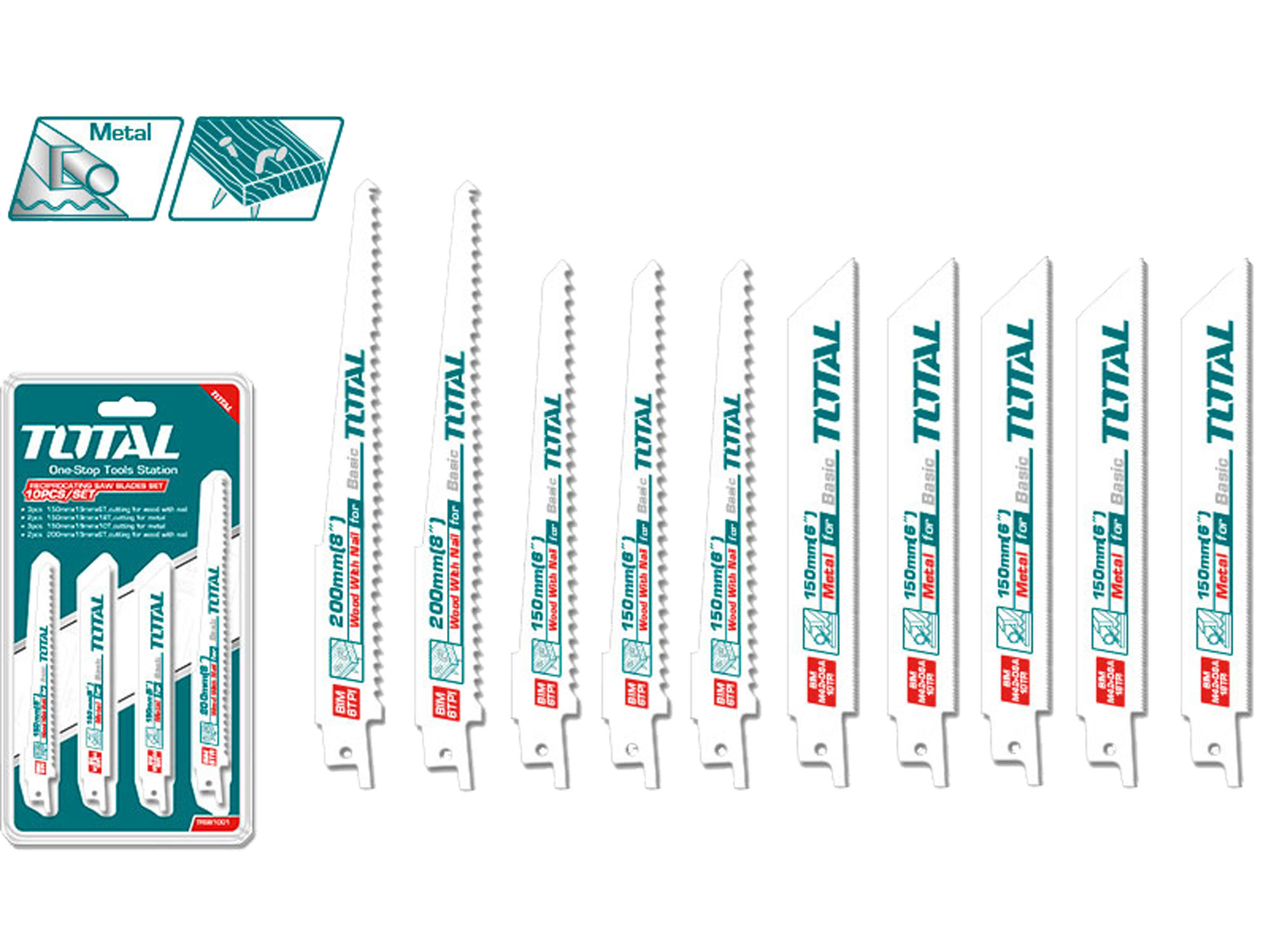 This 10-piece cutting blade set consists of various blades suitable for different materials. It includes 3 pieces of 150 x 19 x 1.2 x 6 teeth wood cutting blades with nails, ideal for cutting wood containing nails without damaging the blades. It also includes 2 pieces of 150 x 19 x 0.92 x 18 teeth metal cutting blades and 3 pieces of 150 x 19 x 0.92 x 10 teeth metal cutting blades, perfect for cutting metal materials. Lastly, the set contains 2 pieces of 200 x 19 x 1.2 x 6 teeth wood cutting blades with nails, for larger wood cutting projects.