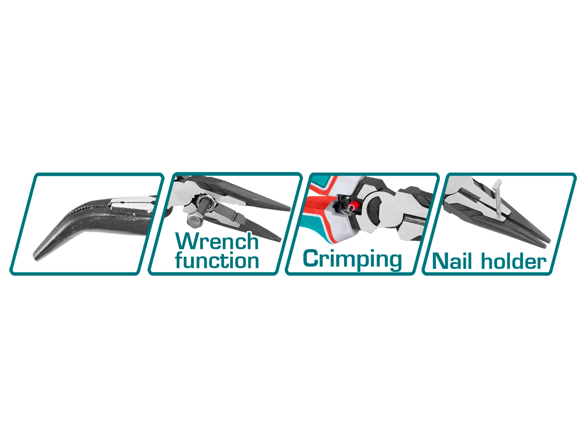In addition to its standard functions, the Total Bent Half Round Pliers also offer a crimping function, a nail holder function and a spanner function. These additional functions make them an even more valuable tool that will help you complete a variety of tasks more efficiently.