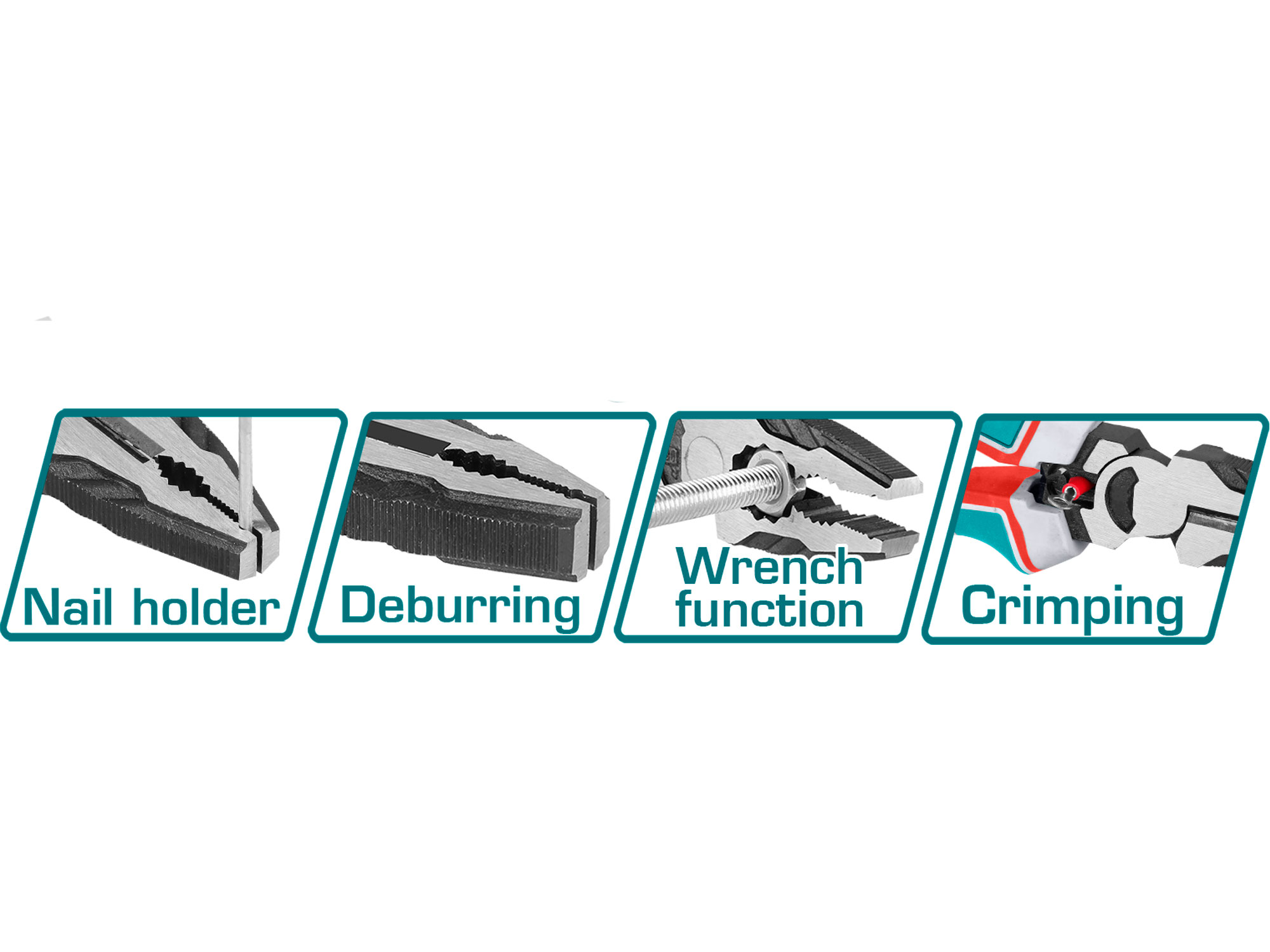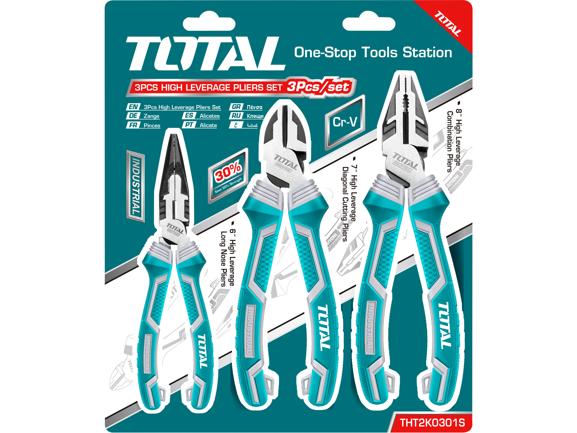 This set of 3 pliers from Total is specially designed and manufactured for industrial use. It consists of jaws made from high quality induction hardened CrV steel. The metal has been specially treated to increase its durability and longevity and it is polished on the sides to ensure a clean and professional appearance.