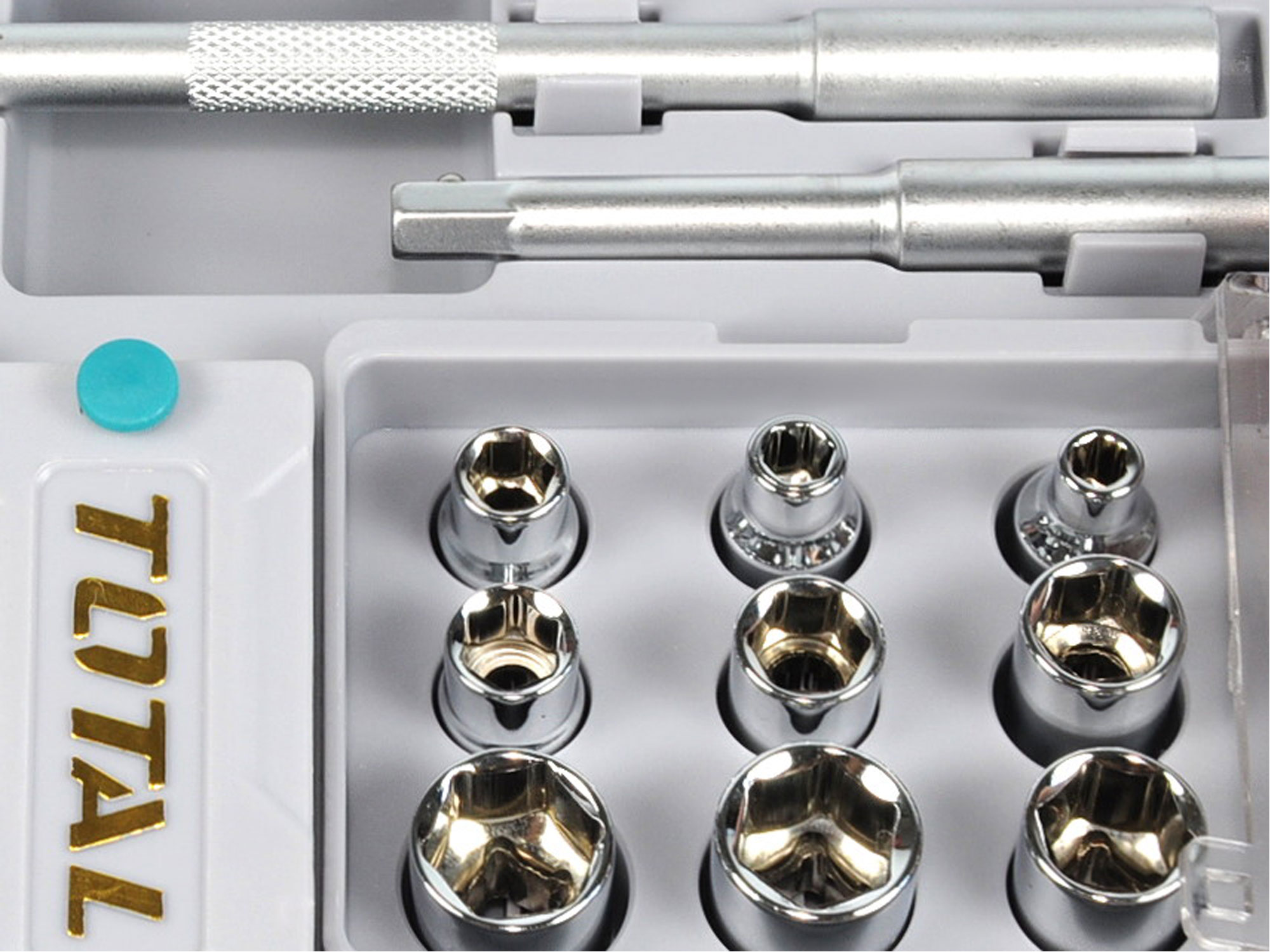 All parts are neatly packed in a TOTAL design box. This box is robust and compact, so it fits easily into any toolbox and you can take it with you wherever you go.