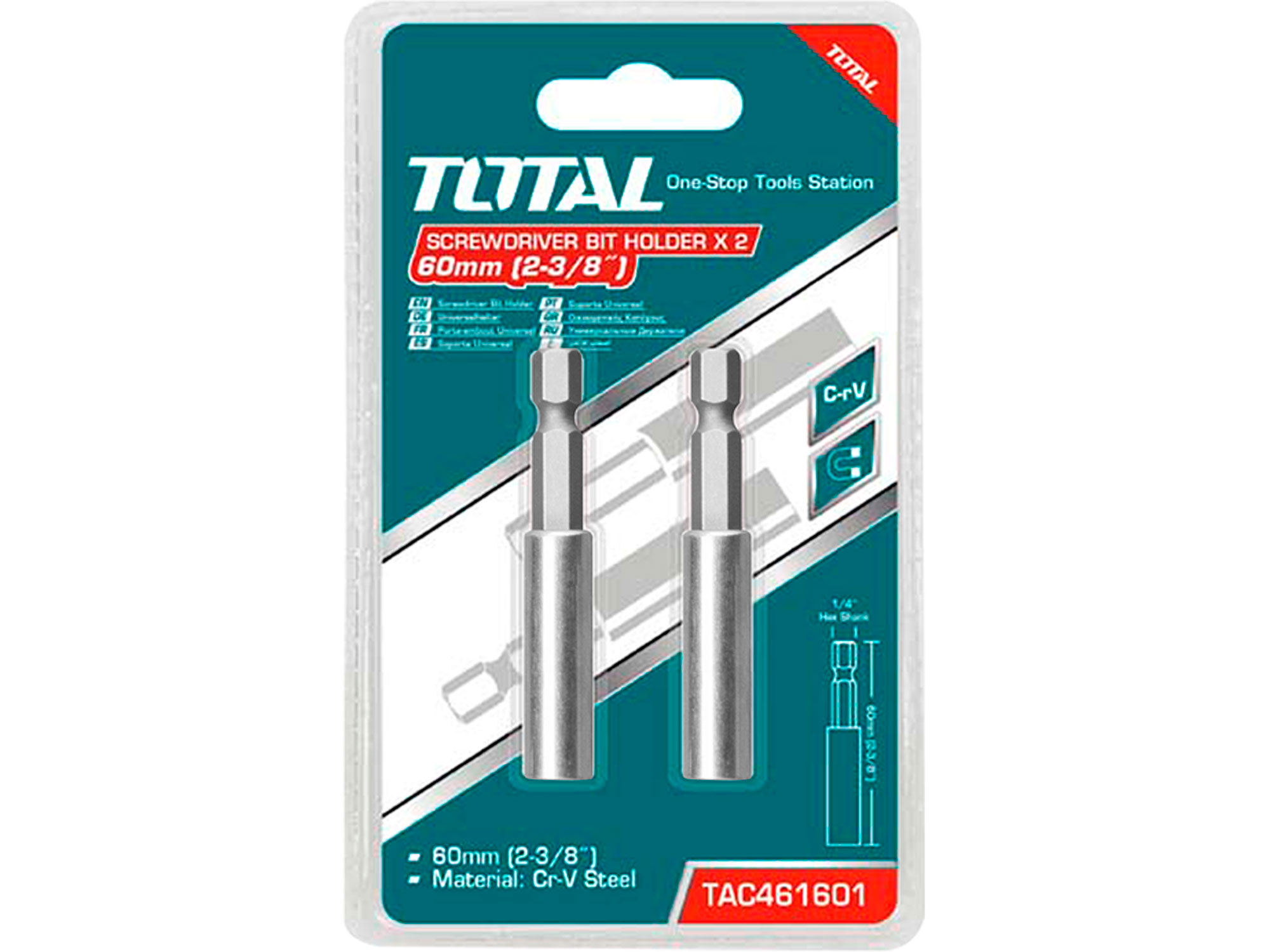 These screw extensions from Total are made from a robust steel and chrome vanadium alloy and offer an additional 60mm length for your fastening requirements. This set includes two screw extensions that offer increased durability and longevity. They are ideal for applications that require a longer screw, such as fastening heavy objects or in areas where space is limited. The screw extensions are easy to install and use and are a practical addition to your tool collection.