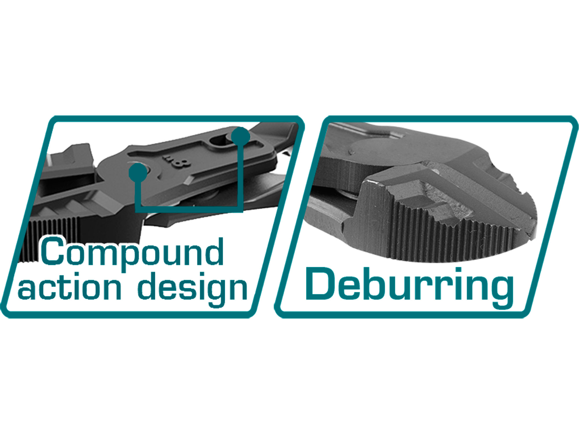 - With a size of 230 mm, these robust pliers are an indispensable tool for every craftsman - Thanks to the side transmission, it is particularly easy to use and enables energy savings of 65 % compared to conventional pliers - Made from chrome vanadium steel (Cr-V), one of the most robust and durable materials on the market - Surface treatment with Teflon coating ensures increased durability and improved performance - The three-colour TPR handle provides a firm grip and maximum comfort while working - The additional deburring function makes these pliers a versatile tool suitable for both splitting and deburring materials - Packed in a half double blister for safe transport and easy storage Manufacturer