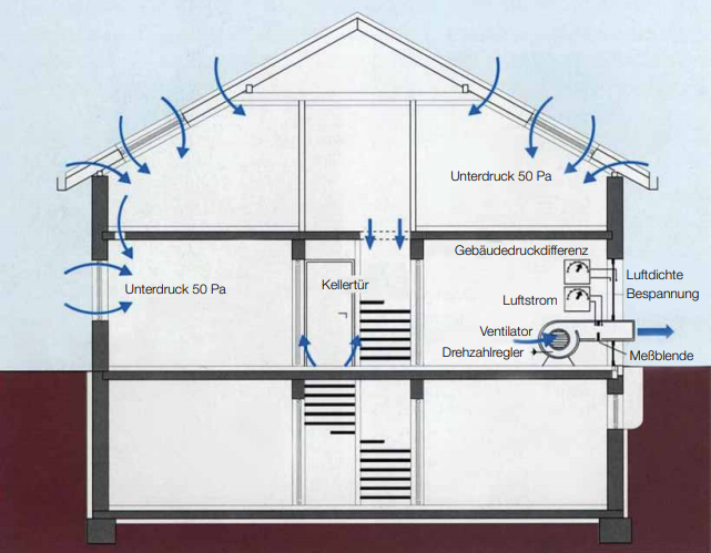 Principle of measuring air permeability. When windows and doors are closed, the speed of the fan is increased until a building pressure difference of building pressure difference of 50 Pa, for example. The volume flow to be read is referred to as the volumetric flow of air permeability .