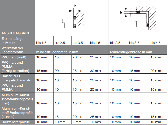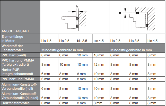To ensure that as few errors as possible are made when dimensioning pre-compressed sealing tapes , the table below has been drawn up by ift Rosenheim . A comparison of Table 1 with Table 2 quickly shows that the joint can be made narrower when using sealing tapes than when using pasty sealants. This is a clear economic advantage of sealing tapes.
