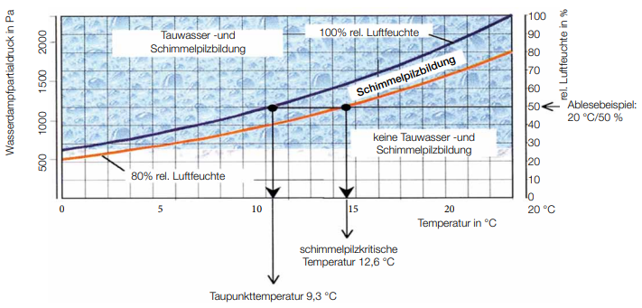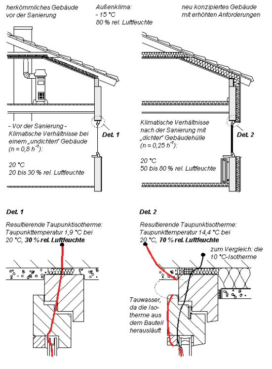 If, as mentioned in Chapter 6, the component temperature drops and the ambient air is no longer able to absorb the moisture, condensation will occur. A temperature of 12.6 ºC has proven to be critical in this case. Using special software, the surface temperatures are determined in a building connection and connected to form a line, the so-called isothermal curve.