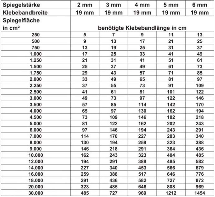 Special note: When bonding, the technical guidelines of the Institute of the Glazing Trade Glaserhandwerks of Verlagsanstalt Handwerk GmbH, Düsseldorf No. 11 Edition 2006/11 must be observed. In the case of overhead and angled bonding, the mirror adhesive tapes can only be used as a mounting aid and mechanical fixing is absolutely essential.